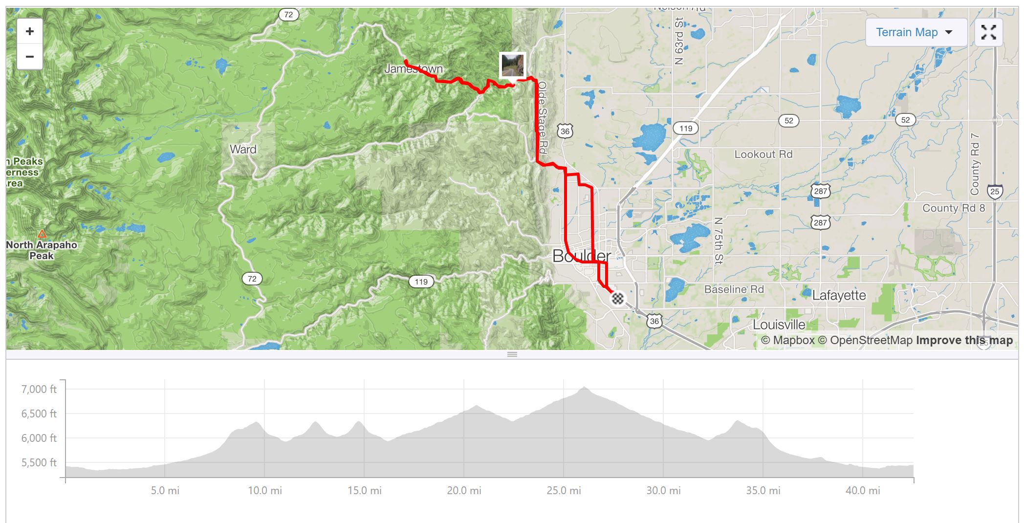 North Boulder on the bottom right, where the road turns is the start of Olde Stage.The bottom of Olde Stage at the bottom right, the left turn is the beginning of Lefthand.Map and elevation profile from Strava