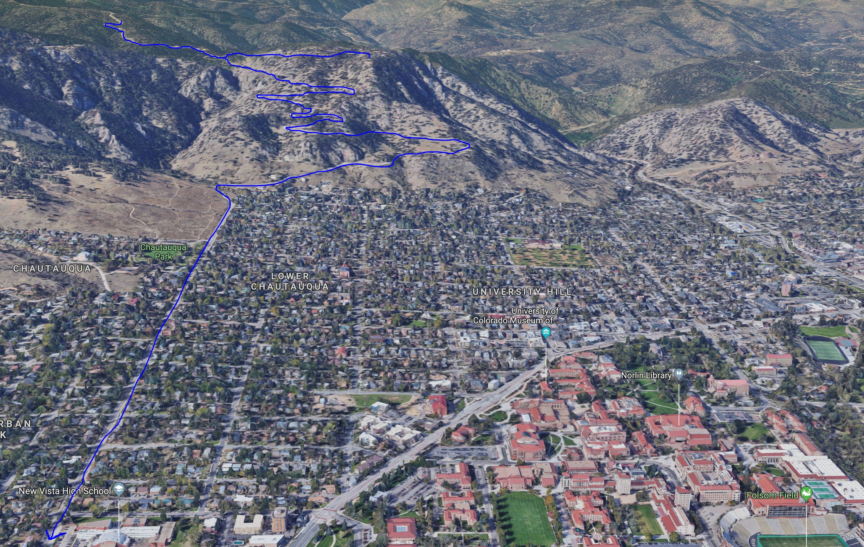 Arial view of the climb from above campus. The route is indicated by the blue line.